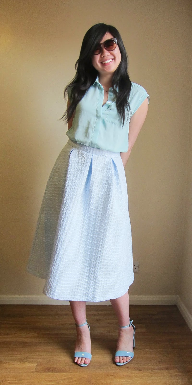 Nevertheless, it's a pretty seafoam colour which I paired with my current favourite trend, the midi skirt. I've been looking round for one for ages, and was going to get one from Asos, but I found this Topshop ripoff on ebay retailing for half the price of the high street brand - talk about luck! Bonus: it's a lovely duck egg blue that sits with my current stockpile of pastels, which I'll have to wait to wear, sadly.